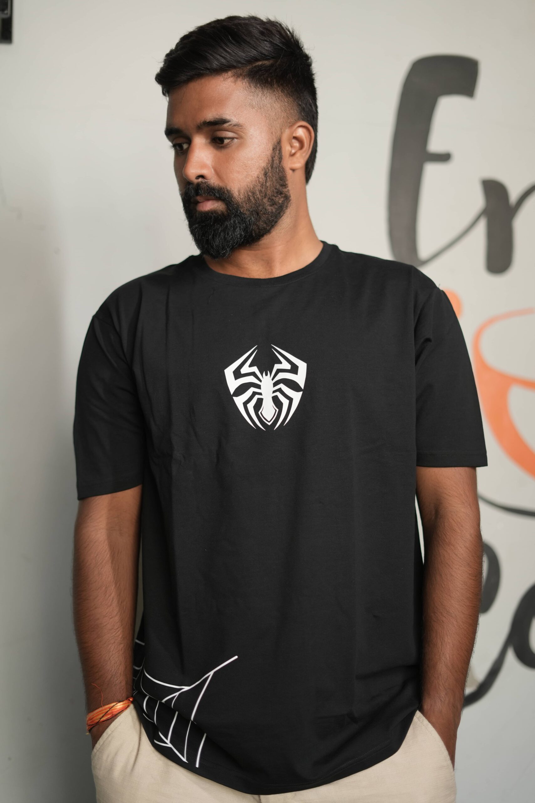 Channel your inner web-slinger with this dynamic cotton lycra t-shirt! The front features a bold Spider logo, instantly recognizable to any hero fan. But the real showstopper is the web design – it starts subtly at the bottom front, then splits and continues dramatically across the back of the shirt.